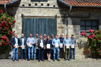 Abschlussurkunden an Landwirte/-innen übergeben. Landwirtschaftsmeister erhalten Meisterbrief.
