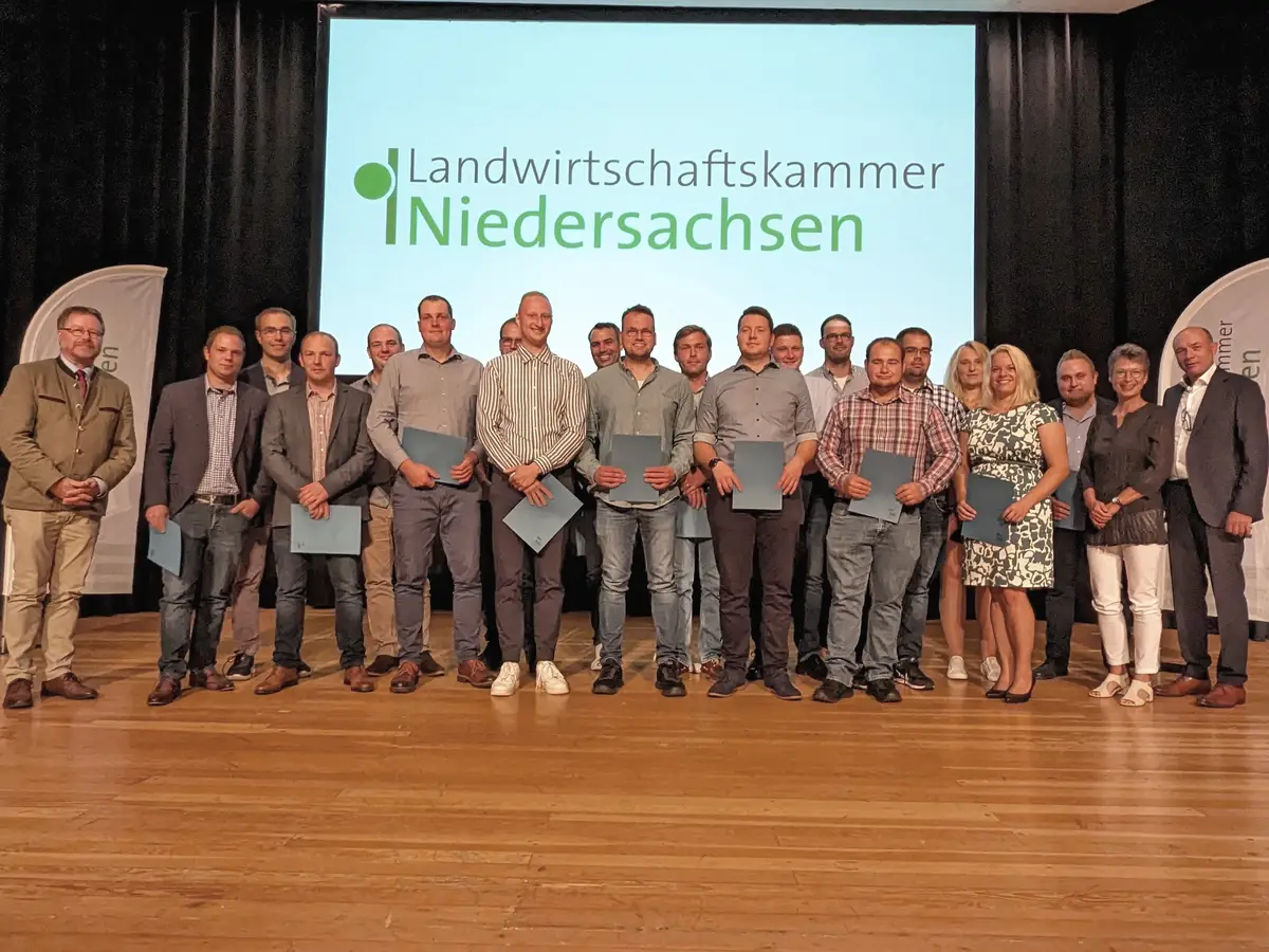 Schließlich erfolgte die Übergabe der Meisterbriefe. Nach einem zweijährigen Meisterkurs bei der Bezirksstelle Northeim unter der Leitung von Tobias Paul bestanden 3 Damen und 12 Herren im vergangenen Sommer die Meisterprüfung. Schwerpunkt der Fortbildung waren Fragen der Betriebswirtschaft sowie der Produktions- und Verfahrenstechnik. Abgerundet wurde die Fortbildung durch einen zweiwöchigen Lehrgang zur Berufsausbildung und Mitarbeiterführung, der die Landwirtschaftsmeister/innen befähigt, zukünftig Auszubildende auf ihren Betrieben einzustellen.