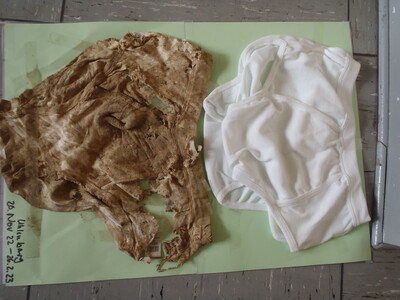 Im März 2023 griffen die Wasserschutzberaterinnen erneut zum Spaten und gruben die teilzersetzten Teebeutel und Unterhosen wieder aus. Es entstand ein gutes Bild von der Bodenaktivität der Versuchsfläche. Anhand des Gewichtsverlustes des Tees kann man die Boden-Aktivität messen. Doch was ist mit der Unterhose passiert? Einige Unterhosen kamen mit nur wenigen Löchern wieder zu Tage. Das war auch der starken Trockenheit in den Böden geschuldet. Aus einem nicht wassergefüllten Boden kann auch kein Nitrat tiefenverlagert werden, was ein gutes Ergebnis für den Grundwasserschutz ist. Über Winter bei geringen Temperaturen ist die Bodenaktivität verringert. Das Bild der zerfledderten Unterhose zeugt von guten Bodenaktivitätsbedingungen für ein Pflanzenwachstum über Winter. Und genau das ist wünschenswert. Die Baumwollhosen dienen als Marker für die Bewirtschafter, auch mal die nicht mit dem Auge sichtbaren Dinge ins Visier zu nehmen und den Boden in Bezug auf Humusgehalt, Mikroorganismenbesiedelung, Struktur und Säuregehalt zu verbessern.