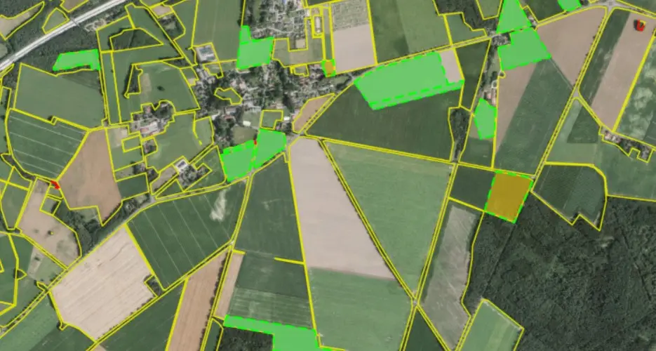Wie im untenstehenden Bild zu sehen ist, ist eine Fläche gelb markiert. Hier konnte die Kultur bislang nicht erkannt werden. Der betroffene Betrieb hat für diese Fläche einen Fani-Auftrag bekommen.