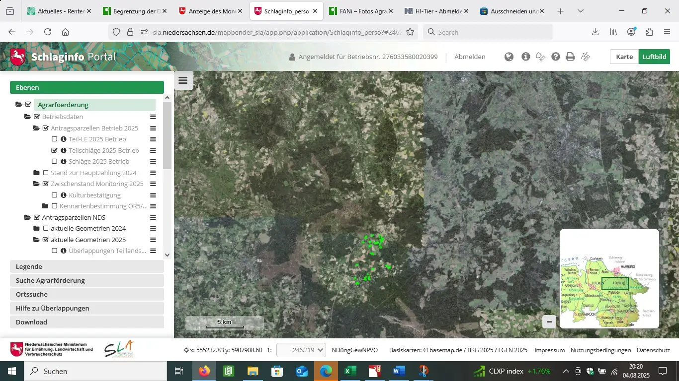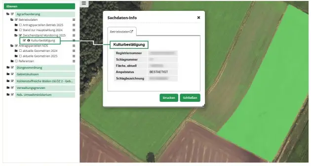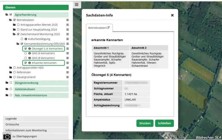 In Schlaginfo ist es möglich, den aktuellen Stand bzw. den aktuellen Status des Monitorings der Flächen einzusehen. Zudem können auch die Kennarten, die in der Ökoregelung 5 bzw. der AUKM GN 56/58 bereits erkannt worden sind, eingesehen werden. Außerdem ist es möglich zu prüfen, ob die im Betriebsprämienantrag angegebene Kultur bestätigt worden ist. Im weiteren Verlauf wird auch die Mindestbewirtschaftung einzusehen sein. Im Folgenden wird die Vorgehens- und Funktionsweise von Schlaginfo erläutert.