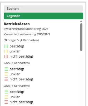 Die vorläufigen Ergebnisse des Monitorings zur Kennartenbestimmung auf Dauergrünland werden durch ein dreistufiges Ampelsystem (grün, gelb oder rot) dargestellt (siehe Abbildung). Das bedeutet, die Flächen sind je nach Status grün, gelb oder rot markiert bzw. scharffiert.