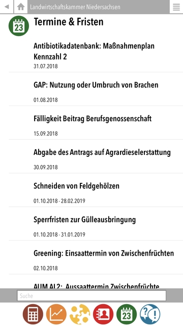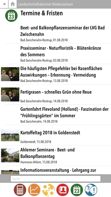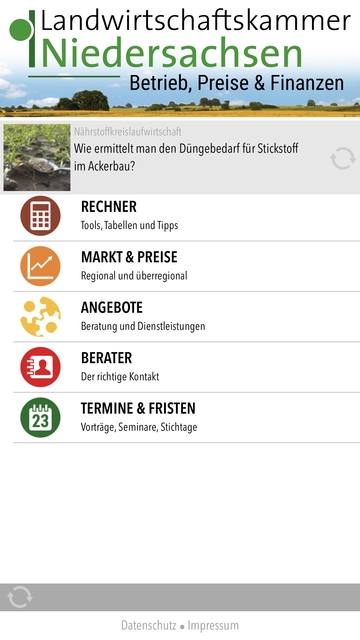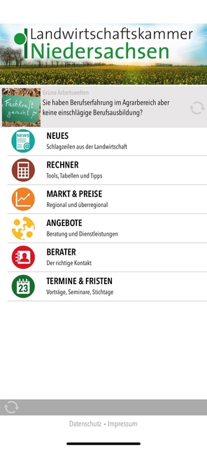 Mit der neuen App der Kammer ist es jetzt jederzeit und Überall, kostenlos und schnell möglich, Informationen der Landwirtschaftskammer abzurufen. Beratungs- und Dienstleistungsangebote aus Betriebswirtschaft, Sozioökonomie oder Markt, die Verbindung zum Berater und eine niedersachsenweite Terminübersicht: Nie war es so einfach, up to date zu sein wie mit dieser App.