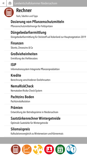Die „LWK Niedersachsen“-App erlaubt den kostenlosen Zugriff auf eine Vielzahl von Tools und Tipps zum schnellen, individuellen Betriebscheck in Zahlen, Daten und Fakten. In der Rubrik Markt & Preise sind darüber hinaus verschiedene, kostenpflichtige Abo-Pakete mit den aktuellen Marktinformationen erhältlich. Ob Informationen, Beratung oder Kontaktpersonen: Finden Sie mit der App der Landwirtschaftskammer Niedersachsen kompetente Hinweise zur Unternehmensführung. Smartphonegerecht aufbereitet, leicht zu bedienen und offline verfügbar!