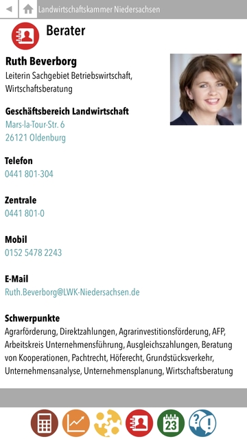 Eine direkte Kontaktaufnahme mit der gewünschten Ansprechperson ist aus der App-Anwendung heraus per Telefon oder über E-Mail möglich.