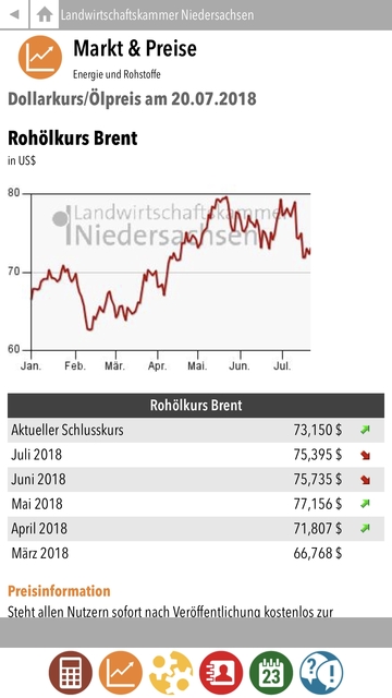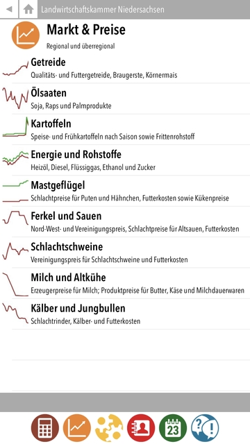 Bequem und schnell sind mit der neuen App der Kammer regionale und überregionale Markt- und Preisinformationen abrufbar. Graphisch, tabellarisch und textlich aufbereitet, erfasst der Nutzer auf einen Blick den Preisentwicklungstrend verschiedener Agrarmärkte, beispielsweise.