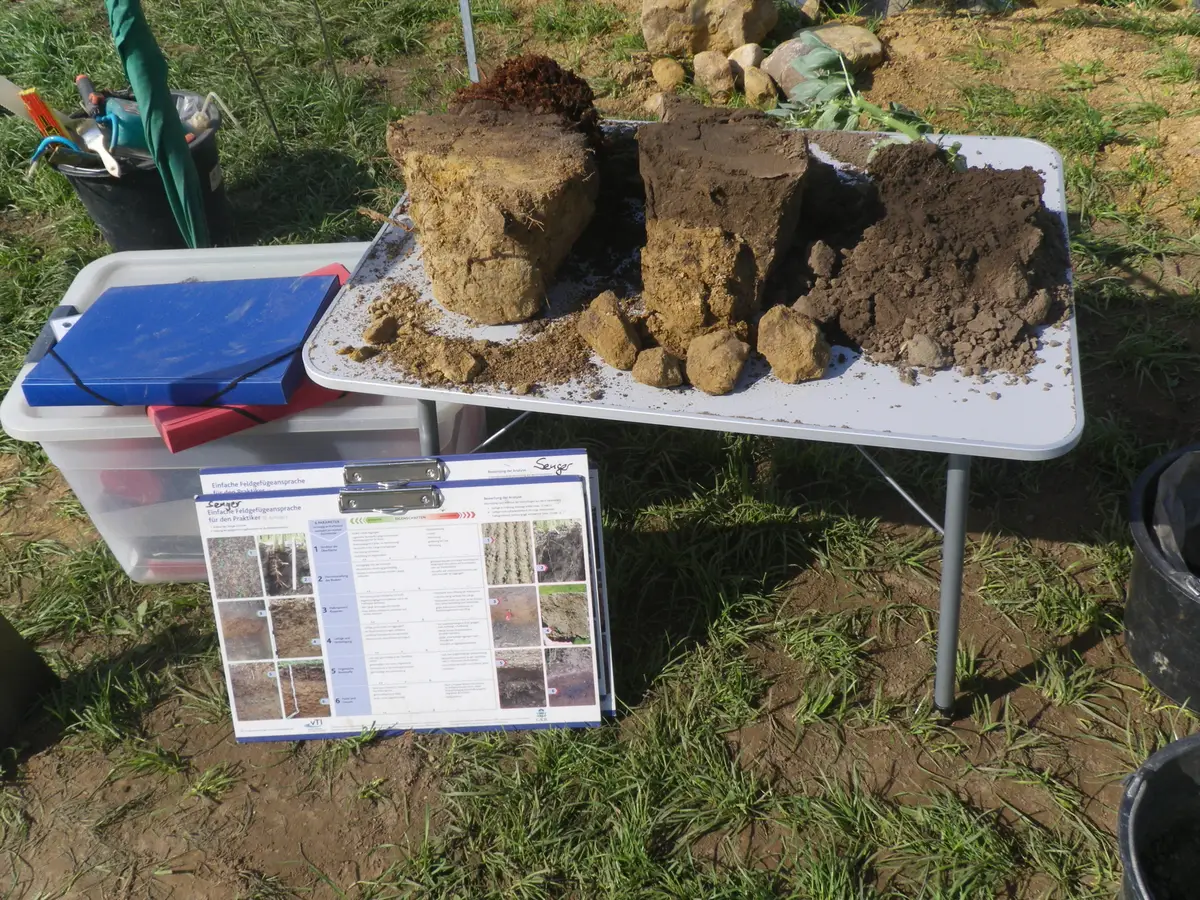 Für die Feldgefügeansprache gräbt man eine kleine Grube mit einem Meter Länge, 50 cm Breite und etwa 50 cm Tiefe, so dass man den Oberboden und den darunterliegenden Unterboden untersuchen kann.