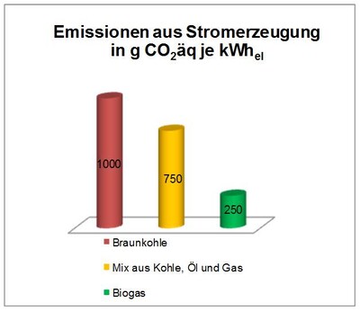 Strom aus Biogasanlagen ist klimafreundlicher als Strom aus den fossilen Energieträgern. Braunkohlekraftwerke zum Beispiel verursachen über 1.000 g CO2äq je kWh Stromerzeugung während Biogasanlagen in der Regel unter 250 g CO2äq je kWh liegen. Gegenüber dem Mix aus fossilen Energieträgern, also Braunkohle, Steinkohle, Öl und Gas, verursacht Biogas mindestens 500 g weniger Treibhausgasemissionen je kWh Stromerzeugung. Die Spannbreite zwischen den Anlagen ist allerdings groß. Sehr vorteilhaft ist ein hoher Wirtschaftsdüngeranteil. Die Treibhausgaseinsparung in solchen Anlagen kann mehr als 1.000 g CO2äq je kWh Strom betragen. Falls dagegen das Gärsubstrat auf trocken gelegten Hochmoorstandorten angebaut wird, können die Emissionen sogar höher sein als bei der Verbrennung fossiler Energieträger.