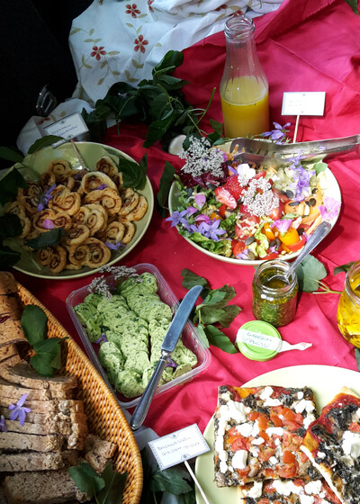 Im Frühjahr stehen sie z.B. unter dem Motto „Nutze die Kraft der Knospen“. Da nimmt sie z.B. besonders die austreibenden Blüten von Bäumen, Sträuchern und Wildkräutern in den Blick. Höhepunkt und ein wahrer Gaumen- und Augenschmaus ist jedes Mal das abschließende Picknick, bei dem sie die Verwendbarkeit der Kräuter zeigt. Mit Kreativität und viel Freude am Ausprobieren überrascht sie immer wieder mit pfiffigen Kräutersnacks.Blätterteigöhrchen mit Bärlauchpesto, in Wildkräuter eingelegter Camembert und Blütenkugeln aus Frischkäse in rot, blau, gelb und grün bringen die Teilnehmenden ins Schwärmen.