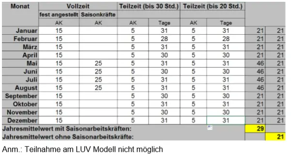 Bisher hatten Land- und forstwirtschaftliche Betriebe mit bis zu 15 Beschäftigten die Möglichkeit am LUV-Modell teilzunehmen, während für Gartenbaubetriebe eine Teilnahme mit bis zu 40 Arbeitnehmern möglich war. Nun liegt die Grenze für alle Unternehmen jeder Fachsparte bei 20 Arbeitnehmern im Jahresdurchschnitt.
