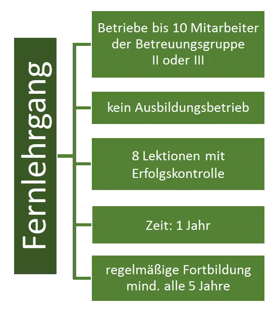 Betriebsinhaber mit bis zu 10 Mitarbeitern der Betreuungsgruppe II und III können einen Fernlehrgang besuchen. Ausgeschlossen sind Betriebe der Betreuungsgruppe I und Ausbildungsbetriebe.