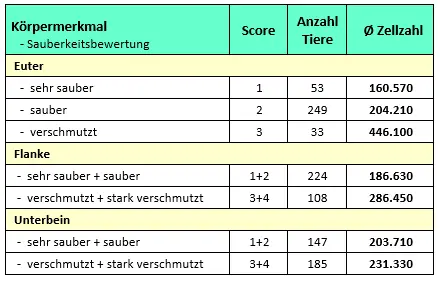Auch im Bereich der Flanke erhöhen sich Zellzahlen bei den verschmutzten im Vergleich zu den sauberen Kühen deutlich und zwar im Mittel um rund 100.000. Beim Unterbein war eine Differenz in den Zellzahlen bei sauberen oder verschmutzen Tieren mit rund 28.000 Zellen feststellbar, also eher im niedrigen Bereich. Dies lässt den Schluss zu, dass das Unterbein zur Bewertung der Sauberkeit der Kühe und dessen Einfluss auf die Eutergesundheit weniger gut geeignet ist.