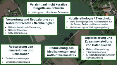 Im Fokus stehen Verbesserungen des Tierwohls und der Tiergesundheit, Untersuchung alternativer nachhaltiger Haltungsstrategien, Digitalisierung, Arbeitsbelastung für den Menschen, Wirtschaftlichkeit, Immissions- und Emissionsmessungen sowie das Nährstoffmanagements.