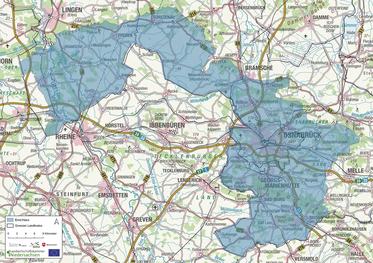 Das Beratungsgebiet (BG) Ems/ Hase erstreckt sich vom südlichen Bereich der Region Emsland bis in die südliche Osnabrücker Region hinein.