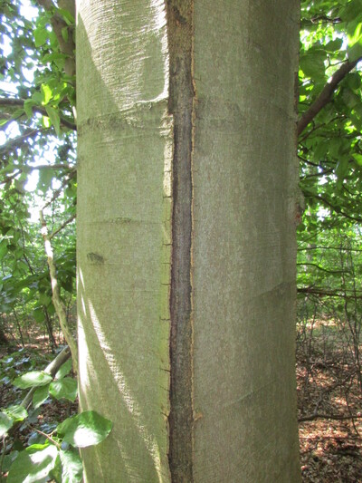 Diese glatte Buchenrinde birgt aber auch Gefahren: Wird der Stamm beispielsweise abrupt sehr stark freigestellt – sei es durch Windwurf der Nachbarbäume oder eine zu starke Auflichtung des Bestandes – prallen ungeschützt Sonnenstrahlen auf den Stamm und können die glatte, dünne, dunkle Rinde so extrem erhitzen, dass der Baum wie die empfindliche Menschenhaut mit Sonnenbrand reagiert.