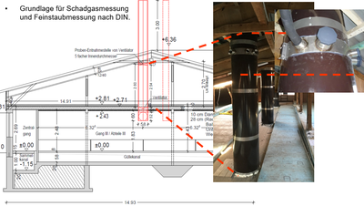 Zur genauen Erfassung des Abluftvolumenstromes eines Abluftkamins wurden zwei Sensoren, die den Luftdruck im Abteil und außerhalb des Stalles erfassen, verbaut. Mit Hilfe der Druckdifferenz beider Sensoren und im Labor kalibrierter Abluftkamine lässt sich die Abluftmenge genau ermitteln. Der Vorteil gegenüber Messventilatoren liegt darin, dass dieses System nahezu wartungsfrei ist und unveränderbare exakte Messdaten liefert.