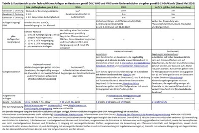 Die nachfolgende Tabelle 1 ist eine Abbildung der „Kurzübersicht zu den fachrechtlichen Auflagen an Gewässern gemäß DüV, WHG und NWG sowie förderrechtlichen Vorgaben gemäß § 15 GAPKondV (Stand März 2024)“. In der Tabelle (pdf-Datei), die im Anhang zum Herunterladen verfügbar ist, gelangen Sie über die blau hinterlegten Verlinkungen zu den Rechtsgrundlagen.