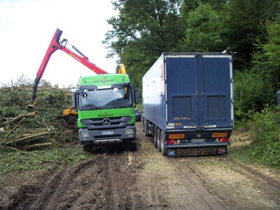 ◾ Beispiel 2: Ein älterer Waldmantel hat sich sukzessive immer weiter Richtung Feld ausgebreitet und somit die Ackerfläche stetig verkleinert. Ein Zurückdrängen des Waldes im Winter im laublosen Zustand aus dem Bestandesinnern heraus wurde aufgrund der Topographie und mangelnden Frosttagen mehrfach verschoben, auch weil die Hackerlogistik ein zweispuriges Fahren neben dem Polter erfordert (Hacker auf LKW-Chassis und daneben der aufnehmende Schubboden-LKW). Daher wurde die Maßnahme in Abstimmung mit dem Landwirt und der ausführenden Firma bei Trockenheit nach der Ernte und nach der Setz- und Brutzeit terminiert.