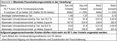 - Die Einführung der 600.000-Euro-Umsatzgrenze führt bereits über Betriebsteilungen zu steigenden betrieblichen Aufwendungen. Geplant ist zusätzlich die Reduzierung der Vorsteuerpauschale von 10,7 % auf 9,6 % in pauschalierenden Betrieben. Damit würden 1,1 % des Nettoumsatzes ohne jeden Ausgleich verloren gehen und so die Vorzüglichkeit der Flächenpacht zur Erhaltung der Pauschalierung erheblich drücken.