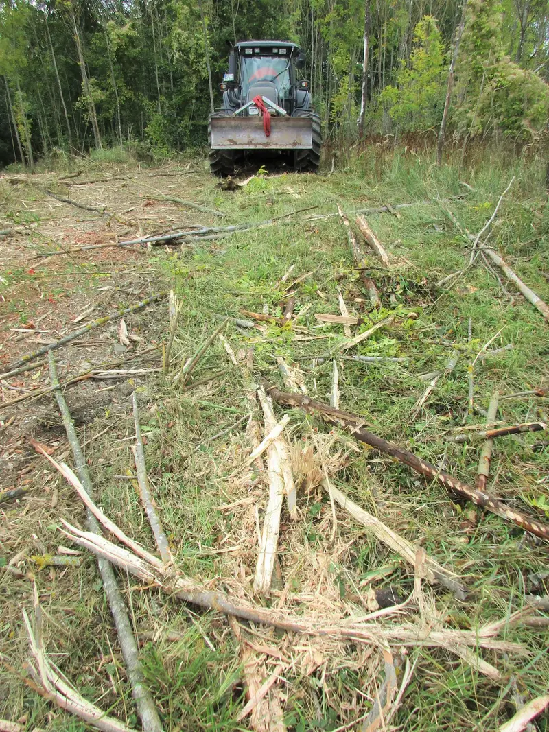 Bei guter Befahrbarkeit ohne große Windwurfstuken oder Hängigkeit wurde hier ein schleppergestützter Mulcher mit großer Arbeitsbreite (2,80 m) gewählt, der vor Ort zur Verfügung stand. Bei einem Gewicht des Aggregates von drei Tonnen und einem Antrieb über die Heckzapfwelle kam aber auch diese Maschine an ihre Grenzen. Eine Erkenntnis hieraus: extrem wichtig ist es, das Gegengewicht vorn am Schlepper entsprechend groß zu bemessen. Liegt eine solche Fläche mit Windwurfstuken am Hang, ist ein Bagger sicher die bessere Wahl.