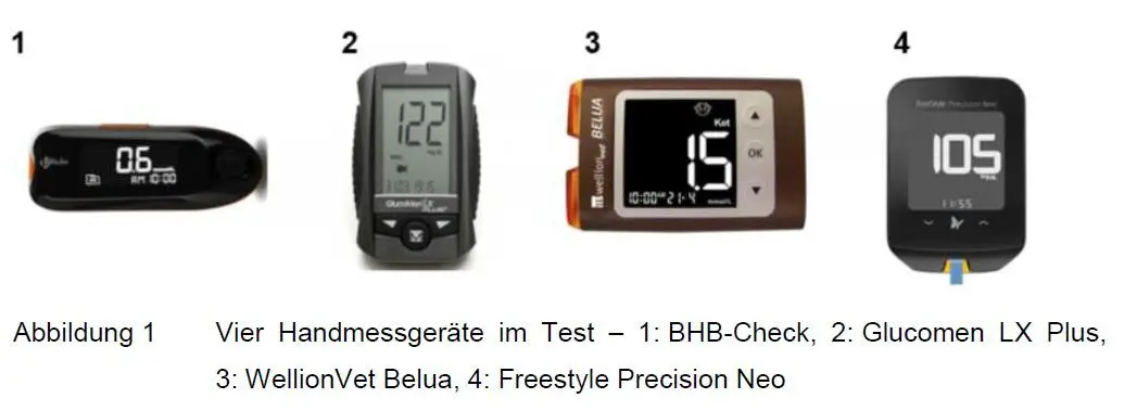 Die Handmessgeräte für Blut liefern die besten Ergebnisse, wenn man alle Tests vergleicht. Insbesondere bei der Nutzung von angepassten Grenzwerten sind die Ergebnisse sehr gut. Hier sind besonders drei Geräte zu empfehlen: der TaiDoc BHB-Check, der Freestyle Precision Neo und der Wellion Vet Belua. Der Glucomen LX Plus wies bei der Handhabung als größte Schwierigkeit die Temperaturempfindlichkeit auf. Zudem sind die Sensitivität und Spezifität geringer als bei den übringen Geräten.