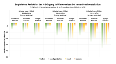 Die Abbildungen 1-3 zeigen die ökonomisch sinnvollen Reduktionen der mineralischen Stickstoff-Düngung bei der aktuellen, angegebenen Preiskonstellation in Abhängigkeit vom tatsächlichen Bedarfswert nach DüV und der Bestandesentwicklung in unterschiedlichen Standortgruppen. Anhand dieser kann sich jeder einordnen. Zur ökonomisch sinnvollen Reduktion bei anderen Preiskonstellationen seien folgende Hinweise gegeben: Grundsätzlich steigt bei höheren Bedarfswerten der Abstand zum errechneten neuen ökonomischen Optimum bei der aktuellen Preiskonstellation an und das N-Reduktionspotenzial erhöht sich entsprechend. Die in den Grafiken angegebene neue Preissituation muss nicht für jeden Betrieb die vorherrschende sein, da der tatsächliche Kauf und Verkauf individuell zu anderen Preisen erfolgt sein kann. Aus diesem Grund sind beim Übertragen der Reduktionspotenziale auf den eigenen Betrieb folgende Aspekte zu berücksichtigen: