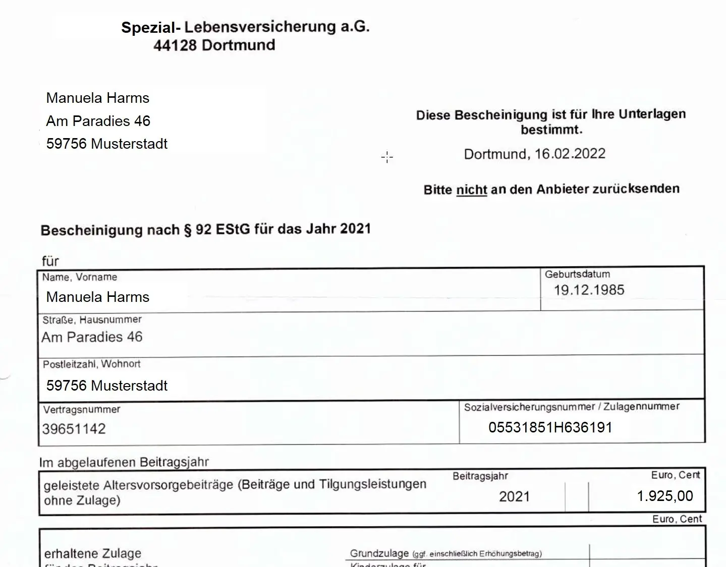 Bescheinigung nach § 92 EStGWiebke Wennemer Dies kann unterschiedliche Gründe haben z.B. eine fehlende Alterskassennummer auf dem Zulagenantrag, eine Alterskassenbefreiung oder ein zu geringer Eigensparbetrag. In den allermeisten Fällen ist der Vertrag nur durch die Zulage für die Altersvorsorge interessant. Setzen Sie sich daher mit dem Vermittler ihres Altersvorsorgevertrages in Verbindung. Dieser kann einen Festsetzungsantrag stellen, um vielleicht ihre Zulage doch noch zu sichern. Falls ein zu geringer Eigenbeitrag gezahlt wurde, ist dies nicht zu ändern. Legen Sie sich für dieses Jahr die Prüfung der Riester-Einzahlungshöhe fürs Jahresende auf Termin, oder zahlen sie generell den Maximalbeitrag (2.100 € minus Zulage).
