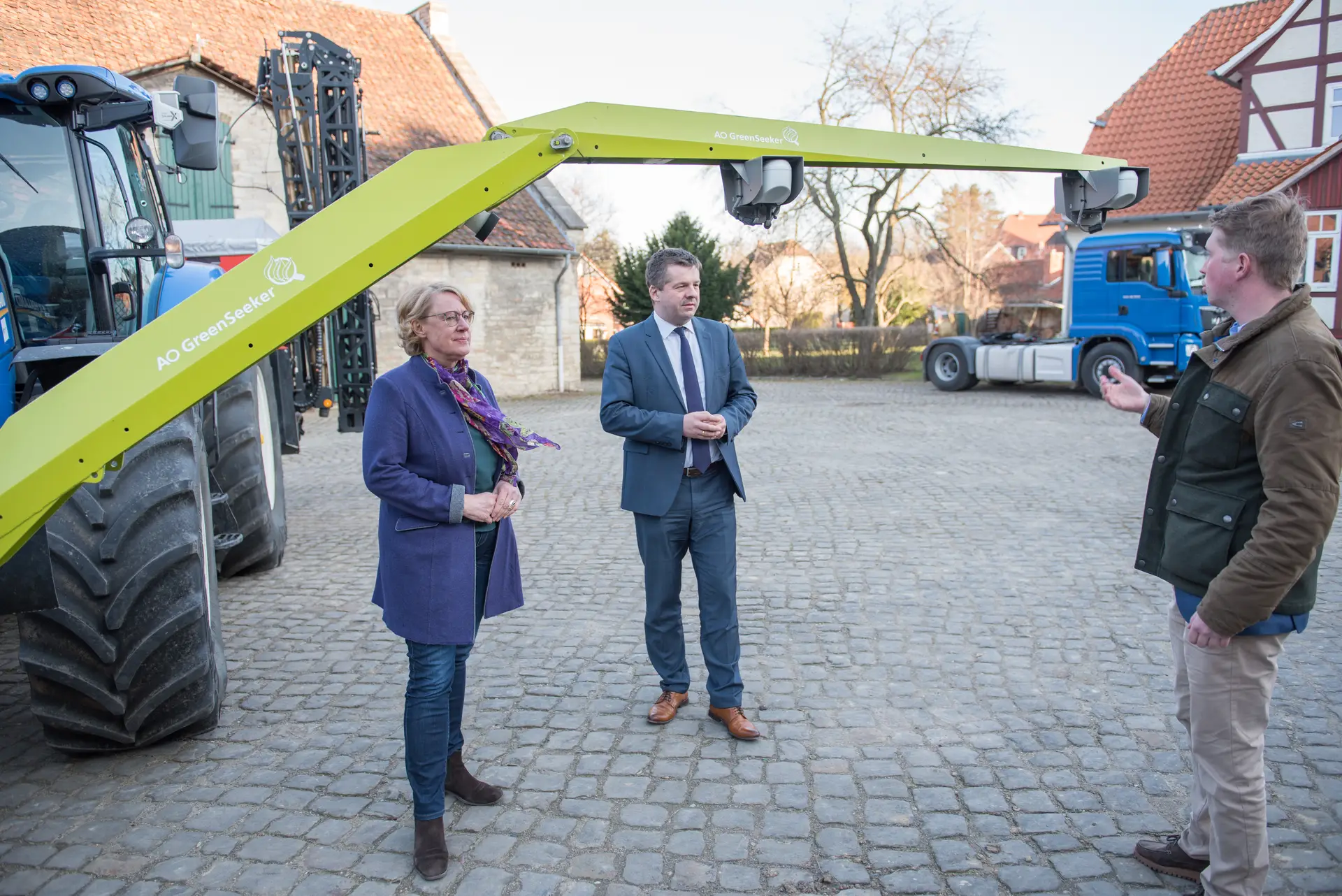 Jobst Gödeke (r.), Leiter des PraxisLabors Digitaler Ackerbau, erläutert Niedersachsens Agrarministerin Barbara Otte-Kinast (l.) und ihrem Amtskollegen aus Sachsen-Anhalt, Sven Schulze (M.), die Ausstattung der innovativen Einrichtung im Kreis Helmstedt.Wolfgang Ehrecke