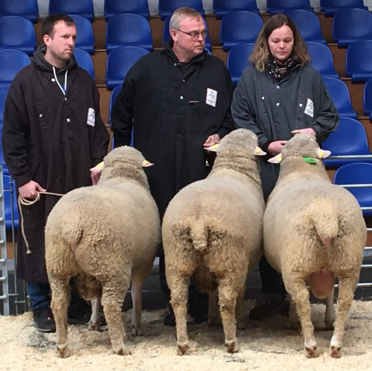 Leineschaf, Altbock, DE010311457912 und Mutterschaf DE010311728999 und DE010311729038, Sammlung Ia + Sieger