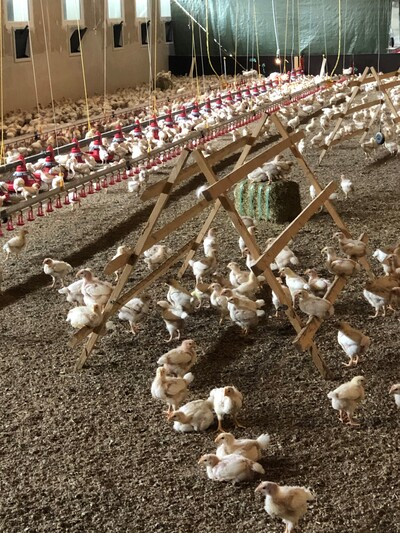 Das Projekt umfasste vier aufeinanderfolgende Durchgänge im Zeitraum von Mai bis Oktober 2021. Eintagsküken der Herkunft Hubbard ISA JA 757 wurden in ein Aufzuchtabteil (300 m2) eingestallt. Nach ca. 28 Tagen wurden die Hähnchen in das Mastabteil (600 m2) umgestallt und weitere 28 bis 32 Tage gemästet. Die beiden Abteile wurden mit etwa 1 kg Dinkelspelzengranulat je m² Bodenfläche eingestreut. Bei Bedarf wurde mit Hobelspänen nachgestreut. Als Beschäftigungsmaterial erhielten die Tiere Picksteine bzw. -schalen und Luzerneheuballen. Damit nachts höhere Ebenen angeflogen werden können, sind die Ställe mit Reutern bzw. an die Decke zu ziehenden pilzförmigen Sitzstangen aus Kunststoff ausgestattet.