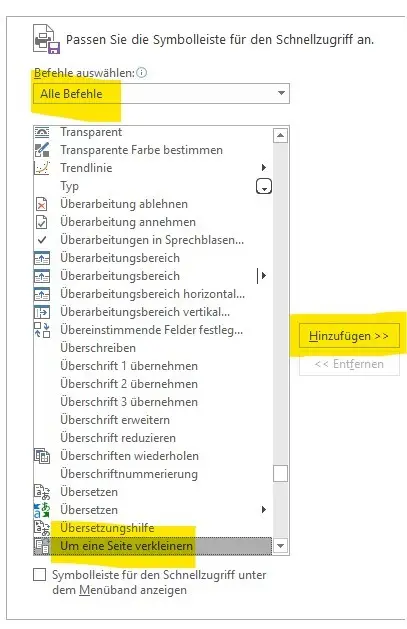 Richtig komfortabel ist es, wenn Sie sich diese Funktion in die Symbolleiste für den Schnellzugriff legen. Diese finden Sie ganz oben links im Word-Fenster. Klicken Sie auf den nach unten zeigendem Pfeil neben der Symbollleiste für den Schnellzugriff , dann wählen Sie WEITERE BEFEHLE aus. Sie sind nun in den Word-Optionen. Nun stellen Sie ALLE BEFEHLE ein und scrollen so lange, bis Sie den Befehl UM EINE SEITE VERKLEINERN gefunden haben. Diesen klicken Sie an und fügen ihn hinzu.