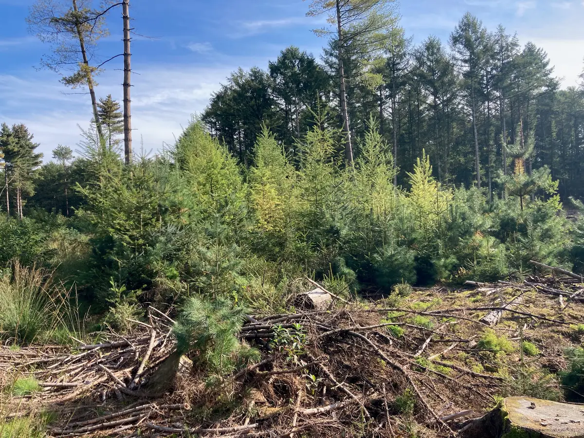 Im genannten Beispiel bietet sich etwa die Douglasie an, sinnvoll kann auch eine Anreicherung des Nadelholzes mit Laubholz sein. Je nach Entwicklung sind Pflegeeinsätze erforderlich, um den jungen Bestand zu differenzieren und ggf. Minderheiten zu erhalten. Im Westen Niedersachsens kommt dabei der Bekämpfung der Spätblühenden Traubenkirsche eine besondere Bedeutung zu, die nordamerikanische Baumart macht den anfänglichen Erfolg durch ihre Konkurrenzstärke sonst schnell zu Nichte.