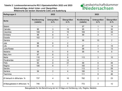 Die Erträge (dt/ha) lagen 2023 aufgrund der guten Wasserversorgung deutlich über denen von 2022. An den relativen Erträgen ist aber gut zu erkennen, dass die meisten Sorten eine genetische Veranlagung zu hohen oder niedrigen Erträgen haben. Überdurchschnittliche Erträge (Tabelle 1 + 2) erzielten in beiden Jahren in der frühen Reifegruppe die Sorten Axenia, Chateau, Florentina, Petra, Vindika, Wega und 4 You. In der Reifegruppe 3 hatten Columbia, Merle und Regina die Nase vorn. Von den erstmals geprüften Sorten zeigten Adorata, Fabricia, Sandra und Taormina überdurchschnittliche Erträge. Nach der Ertragsfeststellung wurden die Kartoffeln sortiert. Ein erhöhter Anteil (mehr als 5%) an Drillingen (kleine Knollen) gab es im Jahr 2023 nur bei der Sorte Gerona. Diese Eigenschaft muss aber nicht unbedingt von Nachteil sein, für bestimmte Verwertungsrichtungen ist sie sogar ein erklärtes Zuchtziel. Genauso wie ein hoher Anteil an Übergrößen je nach Vermarkter als Vor- oder Nachteil angesehen werden kann. Extrem viele Übergrößen (über 30%) hatten Adorata, Axenia, Petra, Sunita, Columbia, Polly, Sandra und Taormina. Wenn Übergrößen nicht explizit erwünscht sind, wäre die Konsequenz für die Praxis eine geringere Stickstoffdüngung, ein engerer Pflanzabstand und/oder ein früherer Krautregulierungstermin. Hervorzuheben ist die Sorte Vindika, die trotz ihrer hohen Erträge relativ wenig Untergrößen und Übergrößen hatte und somit viel vermarktungsfähige Speiseware. Tabelle 3 zeigt die Stärkegehalte der Sorten. Das Jahr 2022 zeichnete sich durch sehr hohe Stärkegehalte aus, im Jahr 2023 waren diese wieder auf einem normalen Niveau.