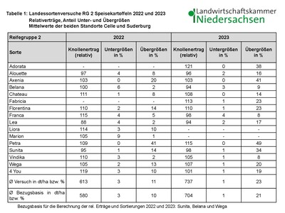 Grundsätzlich ist die Sortenwahl so aufgebaut, dass sich die neuen Sorten mit drei guten etablierten Sorten, unterschiedlicher Kochtypen, messen müssen. Das sind zum Beispiel im frühen Sortiment Sunita, Belana und Wega. Diese Sorten stellen auch die Bezugsbasis für die Berechnung der Erträge und Sortierungen, in relativ Zahlen, dar. Wir prüfen jede Sorte drei Jahre. Deshalb gibt es in den Tabellen nicht von jeder Sorte zweijährige Ergebnisse, weil entweder die Prüfung 2022 abgeschlossen oder eine Sorte erst 2023 neu aufgenommen wurde. 2023 standen in beiden Sortimenten jeweils vierzehn Sorten. Neu aufgenommen wurde bei den frühen Sorten Adorata und Fabricia. In der Reifegruppe 3 gingen erstmals die Sorten Belami, Gerona, Luna Rossa (rotschalig), Sandra (rotschalig) und Taormina an den Start. Von den 34 in 2022 und 2023 geprüften Sorten waren 12 festkochend, 20 vorwiegend festkochend und 2 mehlig kochend. Die Stickstoffdüngung wurde mit 150 kg/ha - Nmin durchgeführt. Bei Kali, Phosphor und Magnesium wurde nach der Bodenuntersuchung und den Empfehlungen der Landwirtschaftskammer gedüngt.