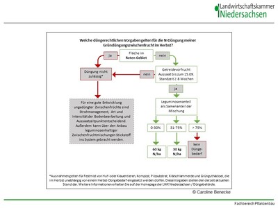 Auf allen Flächen, die nicht unter den § 13 a der DüV fallen, ist eine Stickstoffversorgung der Zwischenfrüchte im Rahmen der Vorgaben des § 6, Abs. 9 (1) der DüV erlaubt. Ein N-Düngebedarf besteht nur nach Getreide und ist bei Zwischenfruchtmischungen abhängig vom Leguminosenanteil. Hierbei sind sowohl der N-Düngebedarf als auch die maximal zulässigen Herbstgrenzen von 60 kg Gesamt-N/ha bzw. 30 kg Ammonium-N/ha zu beachten. Der zuerst erreichte Wert ist einzuhalten. Für alle nichtlegumen Zwischenfrüchte in Reinsaat wie beispielsweise Ölrettich, Senf, Phacelia, Rauhafer, Öllein sowie Mischungen mit einem Leguminosenanteil bis 30 % besteht ein N-Düngebedarf von 60 kg N/ha (N-Ausnutzung). Bei einem Leguminosenanteil zwischen 30 und 75 % ist der N-Düngebedarf geringer (30 kg N/ha N-Ausnutzung) beträgt der Anteil 75 % oder mehr, ist keine Düngung zulässig.