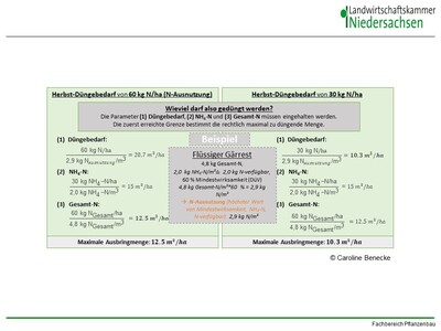 Um die zulässige Ausbringmenge zu ermitteln, sind Berechnungen anzustellen, in denen der N-Düngebedarf, der Gesamt-N und NH4-N (jeweils in Düngermenge auf einen ha bezogen, am Beispiel Gärrest: m³/ha) mit den in dem geplanten Dünger enthaltenen Stickstoffmengen ermittelt werden. Aufgebracht werden darf die zuerst erreichte errechnete Menge aus dem Vergleich von N-Düngebedarf, Gesamt-N oder NH4-N.