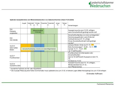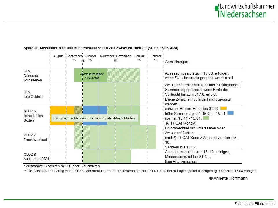 Zudem ist ein Anbau von Zwischenfrüchten erforderlich, wenn in Gebieten, die unter § 13 a der DüV fallen, den sog. roten Gebieten, im Folgejahr Sommerungen angebaut werden, die gedüngt werden sollen, sofern die vorangegangene Hauptfrucht bis zum 01.10. geerntet wurde. Ausgenommen sind nur Flächen in Gebieten, in denen der jährliche Niederschlag unter 550 mm/m² liegt. In Niedersachsen trifft dies für das zugrundeliegende zehnjährige Mittel in 2011 bis 2020 auf keinen Landkreis zu (www.lwk-niedersachsen.de, Webcode 01041956). Zudem gibt es in roten Gebieten wichtige Vorgaben zur Düngung der Zwischenfrüchte. Eine Düngung der Zwischenfrucht ohne Futternutzung ist in roten Gebieten nur mit Festmist von Huf- oder Klauentieren oder Kompost in Höhe von 120 kg Gesamt-N/ha zulässig (§ 13 a, Abs. 2 (5) DüV). Die Zwischenfrucht darf nicht vor dem 15.01. beseitigt werden.