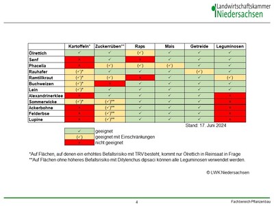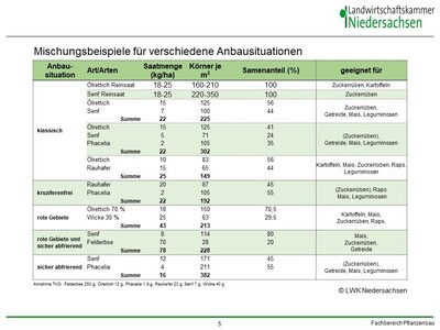 Auf Leguminosen in Zwischenfruchtmischungen muss allerdings verzichtet werden, wenn im Rahmen der Fruchtfolge Leguminosen als Hauptfrucht angebaut werden bzw. ihr Anbau vorgesehen ist. Nur so können die erforderlichen Anbaupausen eingehalten werden, um das Risiko für das Auftreten von Leguminosenmüdigkeit zu vermindern.