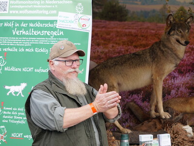 Viele Stände wurden von Tierhalterverbänden und von verschiedenen Bundesländern beschickt, die ebenfalls im Herdenschutz tätig sind und vielfach mit den Besucher*innen ins Gespräch kamen. Vertreten waren etwa die Wolfsberater*innen des Wolfsbüros, das beim Niedersächsischen Landesbetrieb für Wasserwirtschaft, Küsten- und Naturschutz angesiedelt ist. Wolfsberater*innen stehen im engen Kontakt zur Bevölkerung sowie zur Jägerschaft, etwa wenn es um den Einsatz von Wildkameras geht. Nebenan stellte Obmann Bernard Wegner die Öffentlichkeitsarbeit der Jägerschaft Harburg vor: Der mit Präparaten ausgestattete Schau-Anhänger wird häufig in Schulen und Kindergärten eingesetzt, um der nächsten Generation den Wolf auf verständlicher Ebene näher zu bringen.