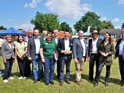 Zufriedene Gesichter: Akteur*innen und Ehrengäste mit Agrarministerin Miriam Staudte (3.v.r.) und LWK-Organisatorin Elke Steinbach (6.v.l.) auf dem 1. Echemer Zauntag am 07.06.2024 im Landwirtschaftlichen Bildungszentrum der LWK im Kreis Lüneburg.Landwirtschaftskammer Niedersachsen