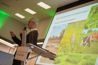 Im Vortragsprogramm machte Prof. Dr. Johannes Isselstein von der Universität Göttingen den Anfang: Grünland übernehme mehrere wichtige Funktionen, betonte er. Grünland sei landschaftsprägend, werde für die Milchproduktion genutzt, spiele aber auch eine große Rolle beim Umwelt-, Klima-, Natur- und Gewässerschutz. Die Milcherzeugung sei für die nachhaltige Sicherung dieser Funktionen des Grünlands von großer Bedeutung.