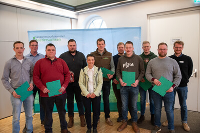 Ausführlicher Bildtext zum Gruppenfoto Silagewettbewerb: Die Gewinner des Silagewettbewerbs 2024 (v.l.): Keno Tannen, Douwe Soepboer, Marc Bohnhorst, Jannik Böger, Dr. Christine Kalzendorf (LWK), Christian Bellmann, Jörgen Thomßen, Renke Hinrichs, Heino Ahrends, Hermann Peper und Tammo Peters (Leiter des LWK-Fachbereichs Grünland und Futterbau).