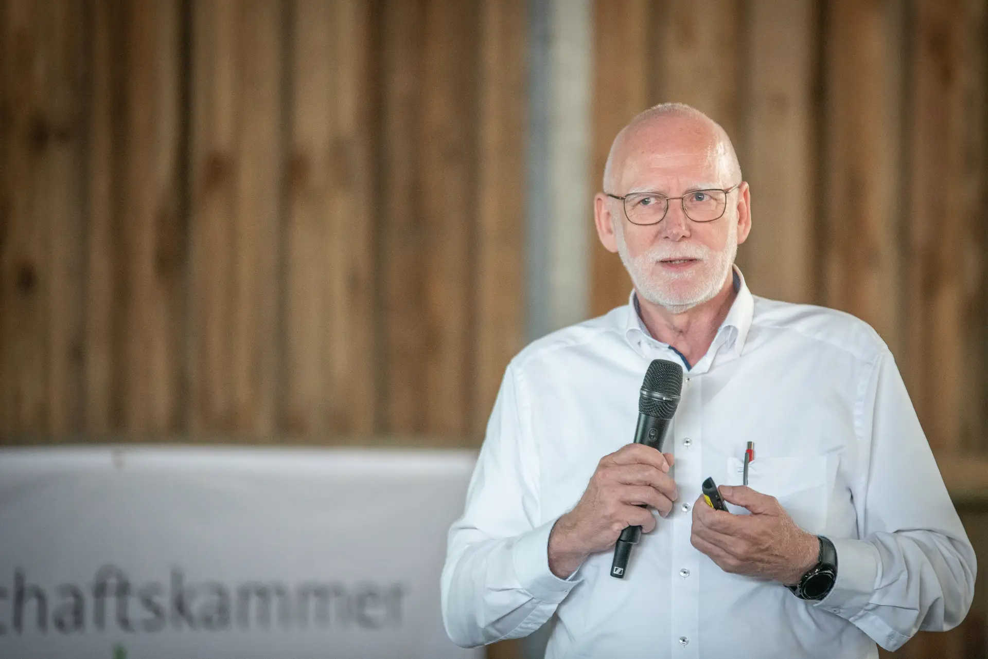 Dr. Hartmut Matthes, Geschäftsführer des Bundesverbands Lohnunternehmen, beim Praxistag Alternative Antriebsenergien für Landmaschinen am 01.07.2025 im LBZ Echem.Wolfgang Ehrecke
