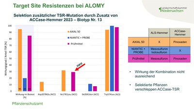 In den schwer bekämpfbaren Ackerfuchsschwanzproben ist festzustellen, dass auch Wirkstoffmischungen von unterschiedlichen Wirkstoffgruppen am Beispiel von Mesosulfuron plus Pinoxaden nicht besser wirken als die Einzelwirkstoffe. Dort wo aber die eine oder andere Wirkstoffgruppe nicht mehr wirkt, wird nach der jeweils anderen Wirkstoffgruppe selektiert. Theoretisch wird so die Bildung von multiplen Resistenzen also sogenannten „Supermutanten“ beschleunigt.