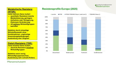 In den Herbizidversuchen der LWK Niedersachsen zeigen Nachauflaufbehandlungen mit Mesosulfuron sinkende Wirkungsgrade, besonders bei dem Einsatz eines mesosulfuronhaltigen Herbizides im Herbst. Aber auch viele Frühjahrsmaßnahmen sind teilweise wirkungslos und im Extremfall kann auf diese Maßnahme dann verzichtet werden. Nachhaltige Unkrautbekämpfung erreicht man mit Wirkungsgraden über 97 %, diese Wirkung war letztmalig nur kurz nach Zulassung des Wirkstoffs festzustellen. Die Wirkungsgrade fallen in dem Augenblick, wenn erste Unkrautpflanzen auf einem Schlag eine beginnende Herbizidresistenz ankündigen. Sind bereits erste Nester von Unkräutern zu erkennen, haben sich vermutlich erste Resistenzen entwickelt. Die Nester von unbeeindruckten Schadgräsern und Unkräutern nach Herbizideinsatz werden mit jeder Vegetation größer, wenn keine Maßnahmen ergriffen werden und die Samen sich über Mähdrescher oder Bodenbearbeitungsgeräte ausbreiten können. Dazu im Vergleich zeigen Fehler bei der Bodenbearbeitung diese „Nesterstrukturen“ eher nicht. Sofortiges Handeln ist notwendig, ansonsten sind möglicherweise in 3-5 Jahren die Nachauflaufbehandlungen in weiten Regionen gegen Schadgräser (insbesondere Ackerfuchsschwanz und Weidelgras) aber auch bei resistenzgefährdeten Unkräutern im Frühjahr wirkungslos!