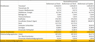 Allein aus der Darstellung der Direktkosten ist abzuleiten, dass ein enormes Kapital zunächst aufgebracht werden muss, bevor die eigentliche Produktion beginnt, geschweige denn ein Erlös erwirtschaftet wird. Wie in Tabelle 1 zu sehen, beinhaltet der reine Tierzukauf fast die Hälfte der Summe der Direktkosten. Es wird deutlich, dass die Rentabilität der Bullenmasthaltung im direkten Zusammenhang mit einem möglichst günstigen Einkauf von Fressern steht, wobei hier ein Zielkonflikt mit den Fleckvieh-Milchkuhhaltern besteht. Sie sind selbstverständlich bestrebt ihre männliche Nachzucht gewinnbringend zu veräußern, um einen Vorteil gegenüber den Milchviehhalter mit rein milchbetonten Rassen zu generieren. Aufgrund des derzeit knappen Angebotes von Fressern, wurde hier ein Einkaufspreis pro Tier von 1.881 € angenommen, welcher anschließend auf Basis des Mastplatzes runter gerechnet wurde. Den zweiten großen Teil der Direktkosten nehmen die Futterkosten ein, welche hier beim Grundfutter aus durchschnittlichen Kosten durch Zukauf und Eigenproduktion betrachtet wurden. Die Kosten für Kraftfutter wurden separat aufgeführt, da hier in der Regel mit eingekauften Raps- oder Sojaextraktionsschrot gearbeitet wird, in Kombination mit Getreideschrot. Ebenfalls ist ein Zinsansatz in Vollkostenrechnungen dieser Art nicht zu vernachlässigen, auch wenn dieser zu den kalkulatorischen Kosten gehört. Gleichwohl könnte das Geld anderweitig angelegt oder Fremdkapital für die Finanzierung genutzt werden. In den Direktkosten sind die beiden Haltungsverfahren nahezu deckungsgleich. Der einzige Unterschied ergibt sich aus dem eingesetzten Stroh. Somit besteht allein aus den Direktkosten bereits eine stattliche Summe, die jeder einzelne Mastbulle pro Jahr verbraucht.