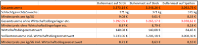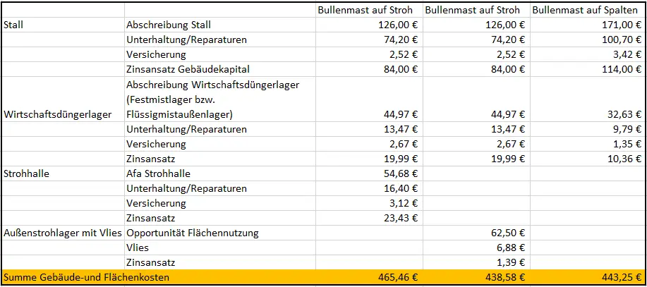 Einen erheblichen Kostenvorteil bietet die mobile Strohlagerung unter Vlies. Bei der Berechnung, siehe Tabelle, wurde aus kalkulatorischen Gründen eine Opportunität zur Flächennutzung des Ackerlandes angesetzt. Das bedeutet, dass der Ertragsausfall als Kostenfaktor angesetzt wurde mit einem angesetzten Deckungsbeitrag von 500 €/ha und einer Flächennutzung inklusive Zuwege von 1250 m². Die Kosten des Vlieses belaufen sich auf einen Einkaufspreis von 1,50 €/m² und einer Nutzungsdauer von 3 Jahren. Somit kann festgehalten werden, dass den entscheidenden Gebäudekostenfaktor in der Bullenmast die Strohlagerung beziffert. Andererseits darf nicht vernachlässigt werden, dass Strohballen unter Vlies, im Gegensatz zur Hallenlagerung, oftmals Qualitätsverluste durch Feuchtigkeitseinwirkungen über das Jahr nach sich ziehen.