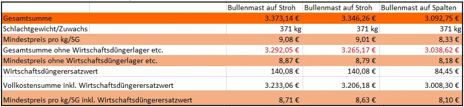 Aus diesen Berechnungen ergeben sich Differenzen in den verschiedenen Haltungsverfahren und Gebäudestrukturen von 277,89 € pro Mastplatz und Jahr. Die angegebene Schlachtzunahme bezieht sich auf ein Schlachtgewicht von durchschnittlich 427 kg pro Mastbulle, was laut Literatur als Durchschnitt bei Mastbullen der Rasse Fleckvieh angenommen werden kann. Da sich die bisherige Berechnungsbasis auf Mastplatz pro Jahr bezieht, muss auch die zugenommene Schlachtgewichtzunahme pro Jahr als Grundlage verwendet werden.