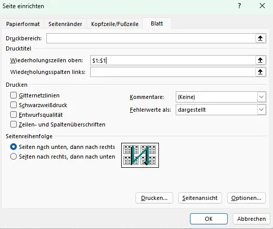 - Unter dem Reiter Blatt findet man den Bereich Wiederholungszeilen oben.