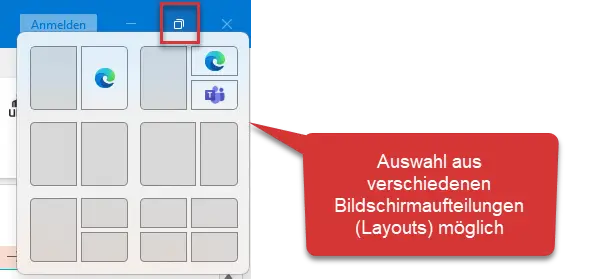 Fahren Sie mit der Maus über das Maximieren-Symbol oben rechts. Windows zeigt verschiedene Layouts: zwei, drei oder vier Fenster nebeneinander. Ein Klick, und die Programme sitzen an der richtigen Stelle. Sie wählen aus, dann positioniert Windows die Fenster automatisch.
